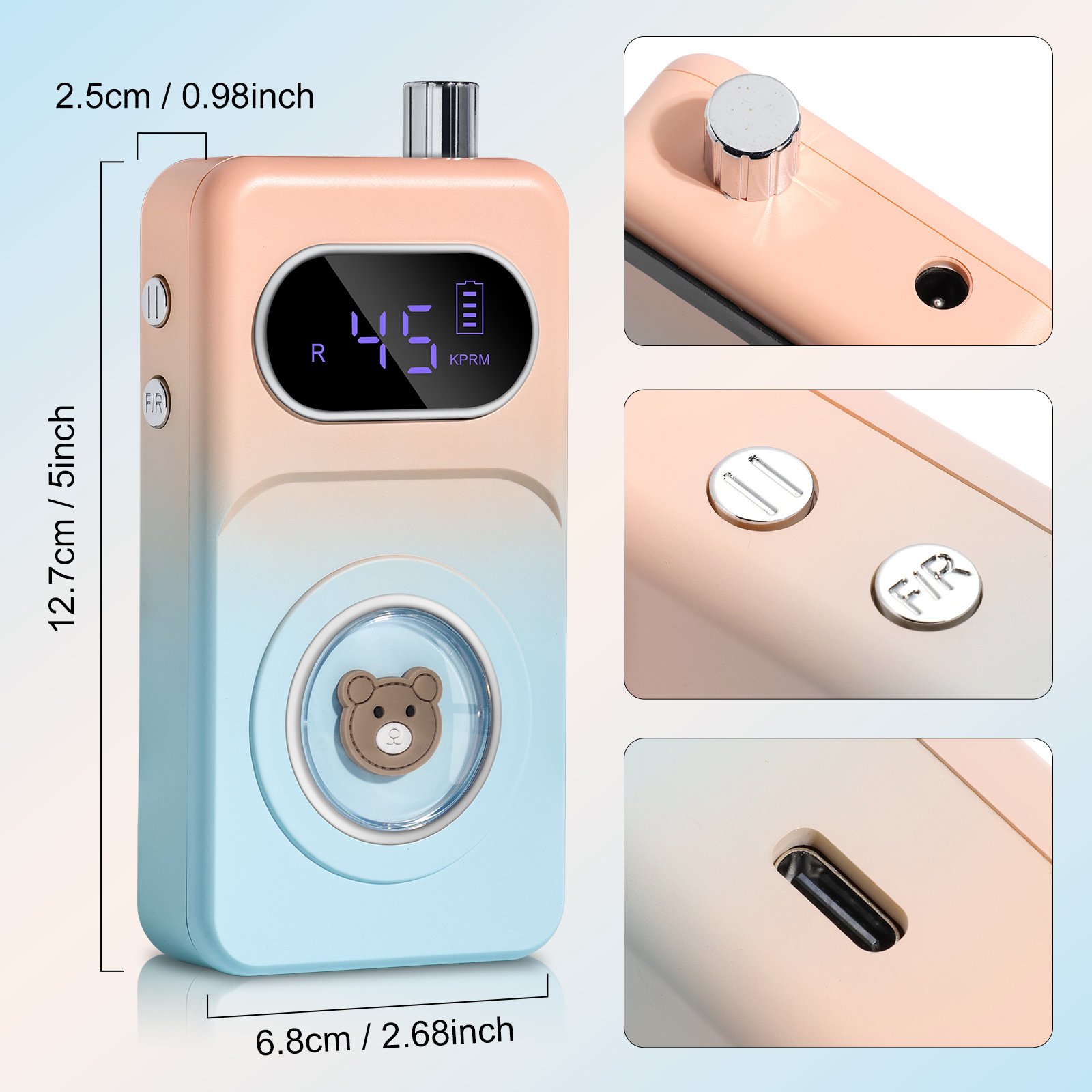 • Low Heat/Noise: The professional nail drill for acrylic nails is designed with a brushless motor, aluminum alloy body, high-quality bearings and internal cooling system.