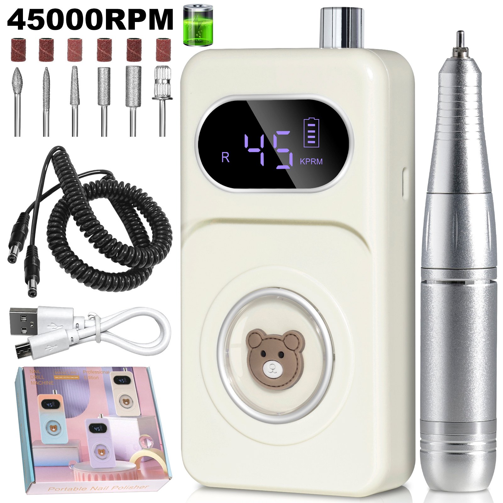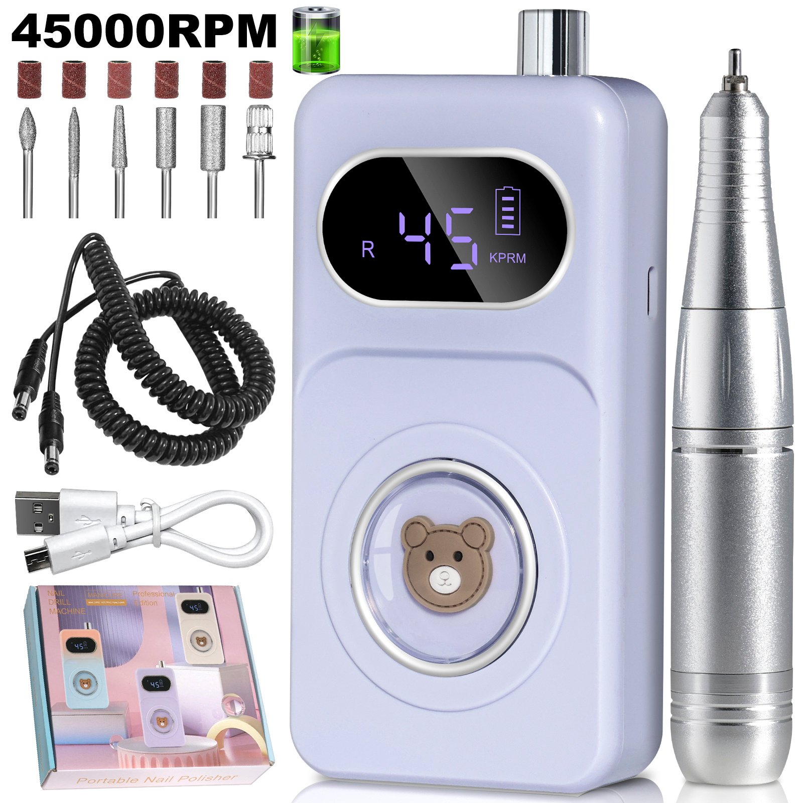 • Maximum speed 45000RPM: The rechargeable nail drill matched with a mobile power supply can work for up to 10 hours after being fully charged for 2 hours.